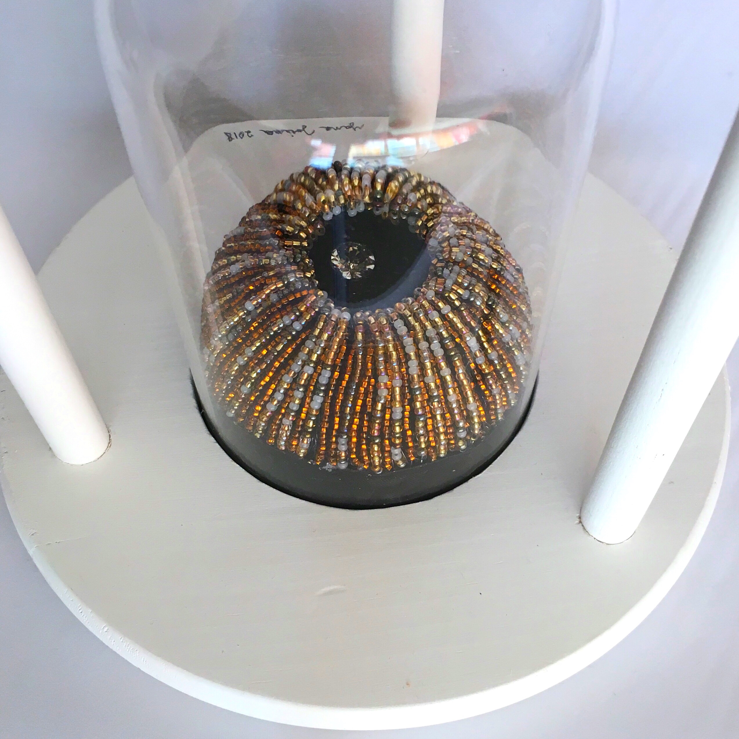 3-dimensional bead work inside of an hourglass. Wooden frame. Height 12", Width 7"