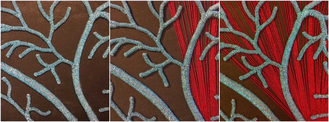The last two weeks have been a bit of a blur. After completing several layers of cells, I have hit a wall and decided that I needed a break from this project. I feel like it is the time to decide on where to put the clear white jewel in the background before it will be covered with stings of beads and become very difficult to access. Similar to my previous work, this jewel would represent hope. But I am stuck on deciding where it should be and feel like I can’t move forward without making this decision.