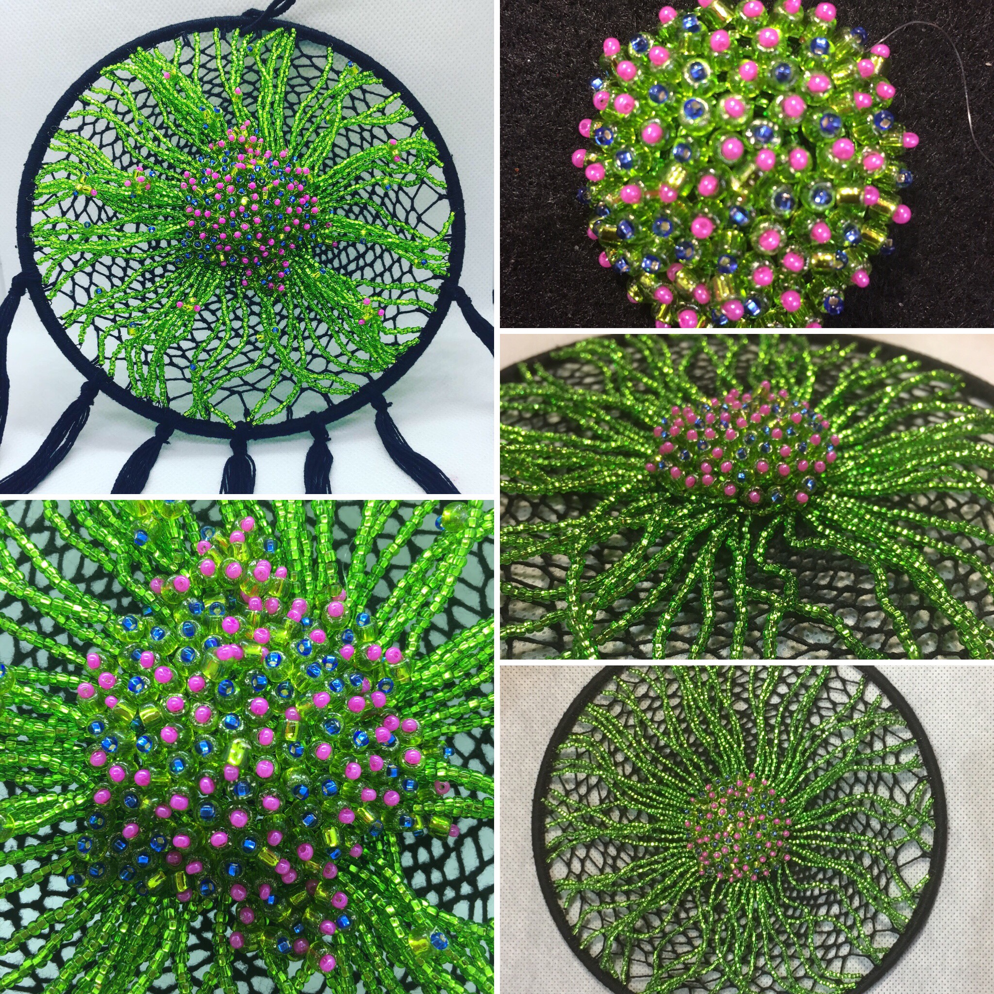Therefore, my collaborator asked me for a special commission – a dream catcher with her favorite cells, based directly on one of the images she acquired in the lab (below). This was a new challenge for me, because while I have made dream catchers during my teenage years, I have never filled them with beadwork. I had some concerns about the density and methods of attaching the wires to the net.