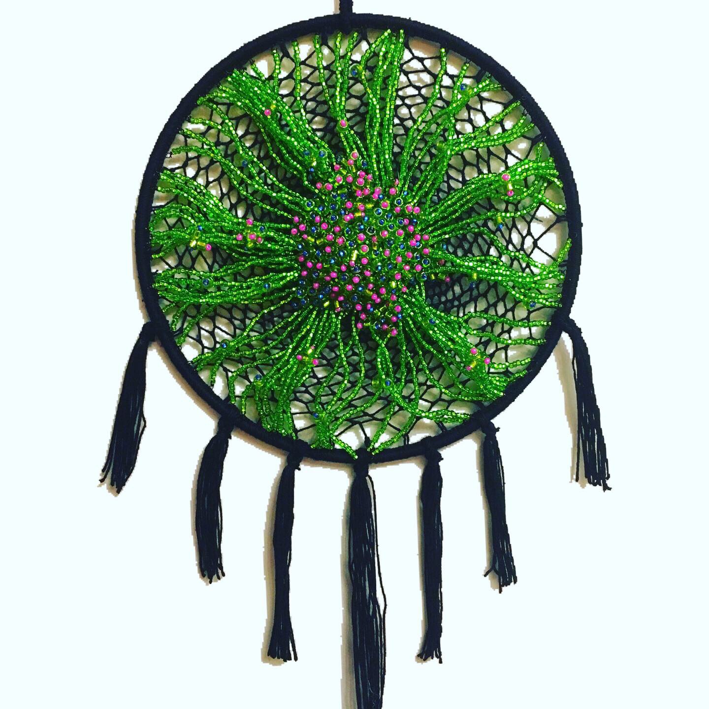 Therefore, my collaborator asked me for a special commission – a dream catcher with her favorite cells, based directly on one of the images she acquired in the lab (below). This was a new challenge for me, because while I have made dream catchers during my teenage years, I have never filled them with beadwork. I had some concerns about the density and methods of attaching the wires to the net.