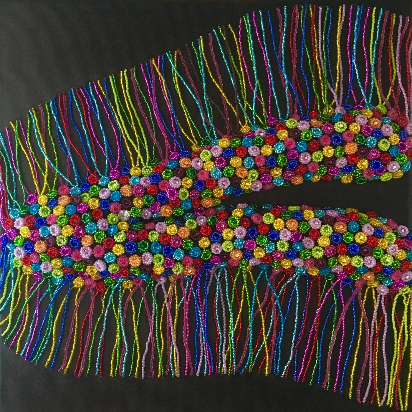 “Fragile Memory” is based on an image of the hippocampus – the part of the brain that is responsible for forming new memories. But it is not just another section of immunostained tissue – rather than having the traditional set of 2 – 4 colors commonly used in microscopy, it is bursting with over a dozen colors! This delightful confetti comes from a “brainbow” mouse, which was genetically engineered to have each neuron labeled with a different color to permit for better tracing of connections, allowing scientists to delineate how different parts of the brain talk to each other.