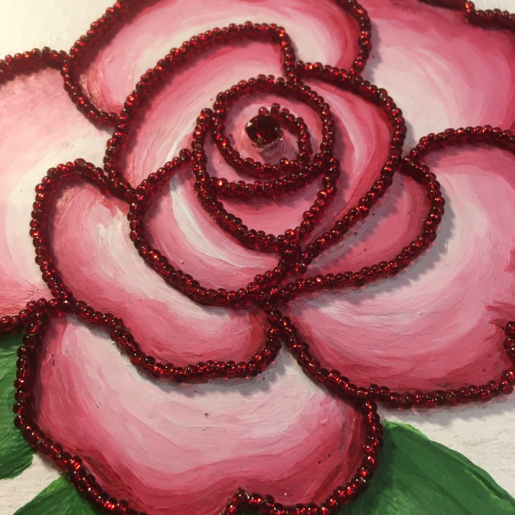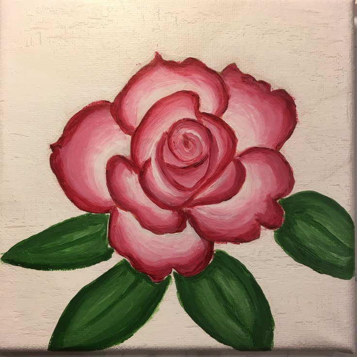 I found a photo of rose that I liked online, printed it and cut it out. I painted a 6″ x 6″ canvas with white paint and, after it dried, used water-thinned white glue to decoupage the photo onto it. I mixed the glue and water at about 1:1 ratio.