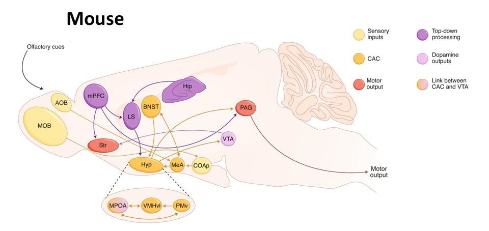 While there are substantial differences in brain circuits that regulate aggressive behaviors across species, the basic social behavior network (SBN) is the same. The circuit consists of sensory inputs, such as smell for mice and sounds for birds; followed by processing in the core aggression circuit (CAC); resulting in a physical response. Both mice and birds are particularly sensitive to an intruder entering their territory. While mice often proceed directly to pushing or biting their assailant, birds will often first try to solve a conflict by giving a “soft song” warning. And humans… Well, humans are much less predictable.