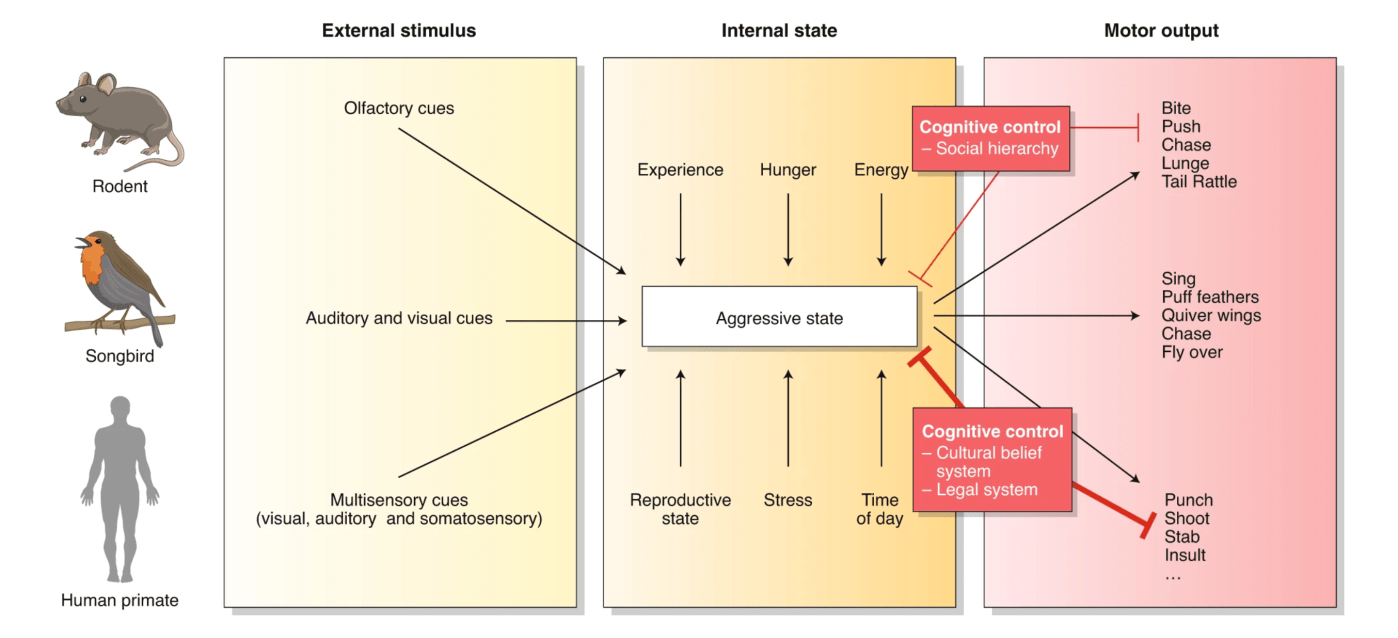 Similar to almost any behavior, aggression consists of 3 stages: 1) a sensory trigger or input; 2) change of internal state or action taken; and 3) the resulting outcome. Specific aspects of all of these stages vary widely across species: