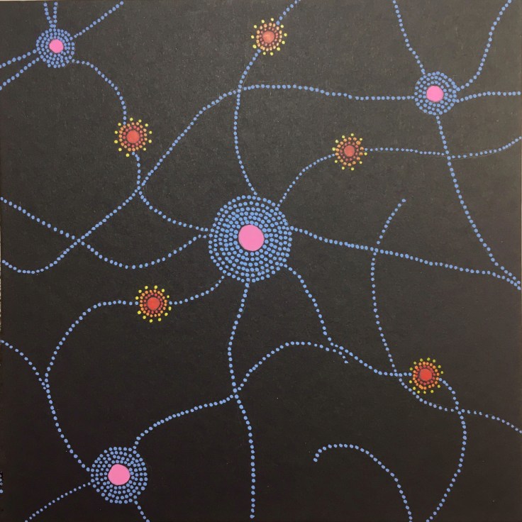 I have a ton of close up photos of my beaded art that are beautiful in their own way, but never see the light of day. So here are a few of them recreated as pointillist drawings. The Brain Project close up (“Connected”) now follows my order of colors (with a little bit of interweaving).