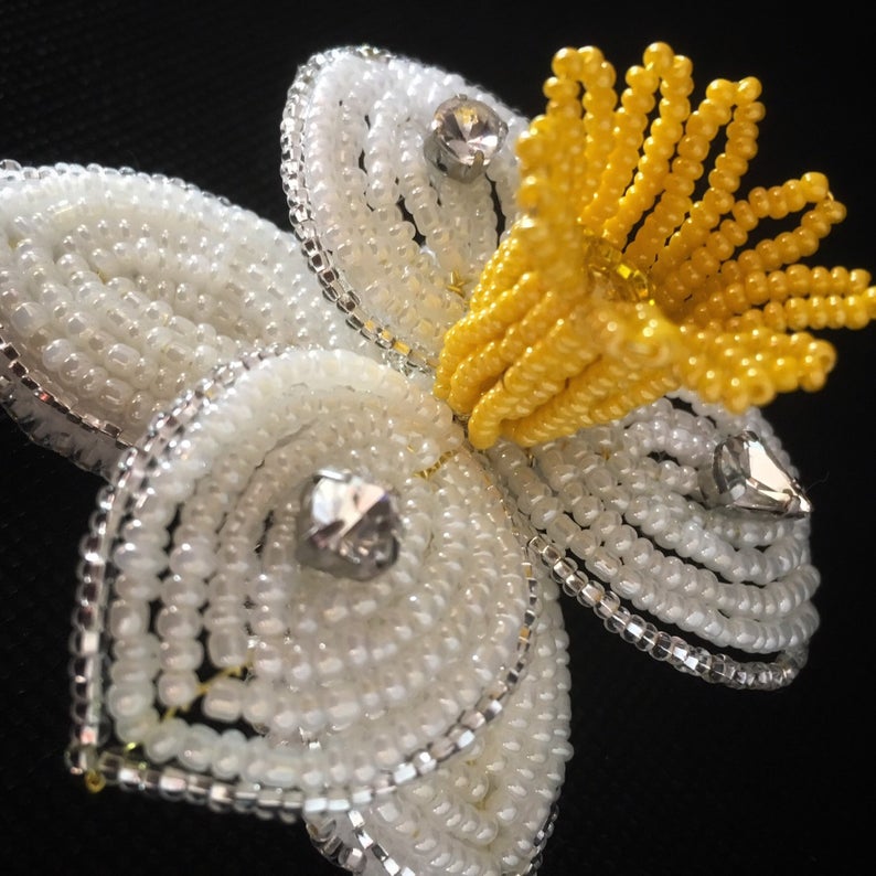 This beautiful beaded daffodil has 2 functions. You can wear it as a brooch, but when it’s not in use, it can also serve as a wall decoration. In fact it becomes a part of a small painting.⠀