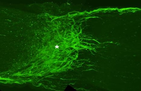 “Tortured”, for example, was inspired by a series of images similar to the one shown below. It shows an injured nerve that is attempting to regenerate. The asterisk indicates the injury site, and the green fibers on the right are trying to grow back out.