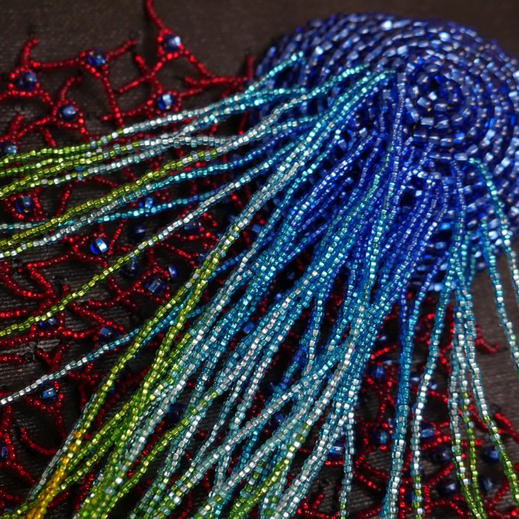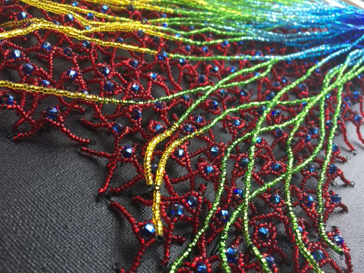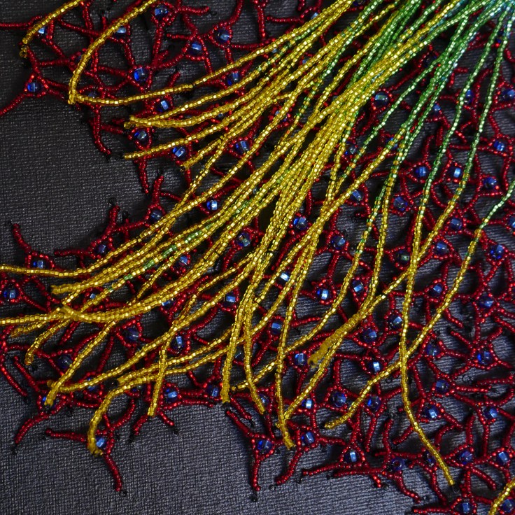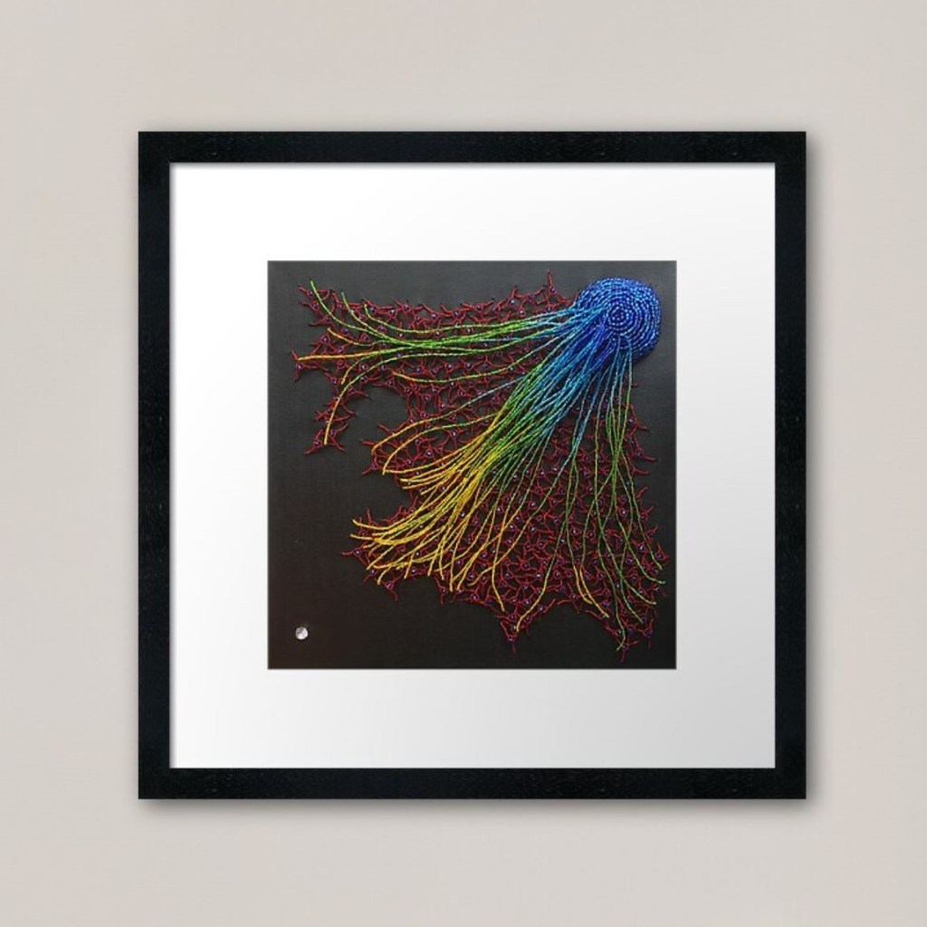 3-dimensional bead work on canvas. Ready to hang. 13″ x 13″