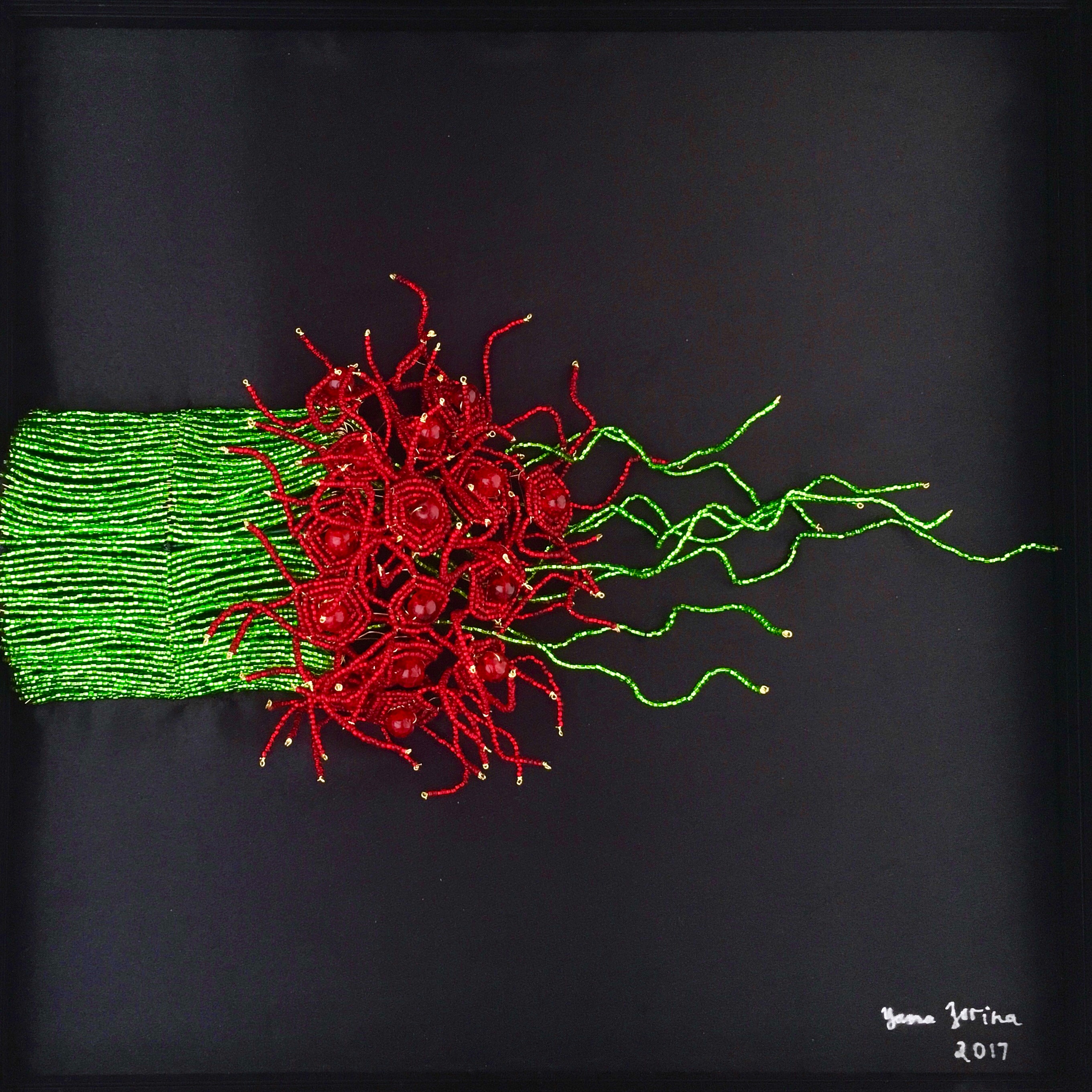 3-dimensional bead work on satin. Framed. 12″ x 12″